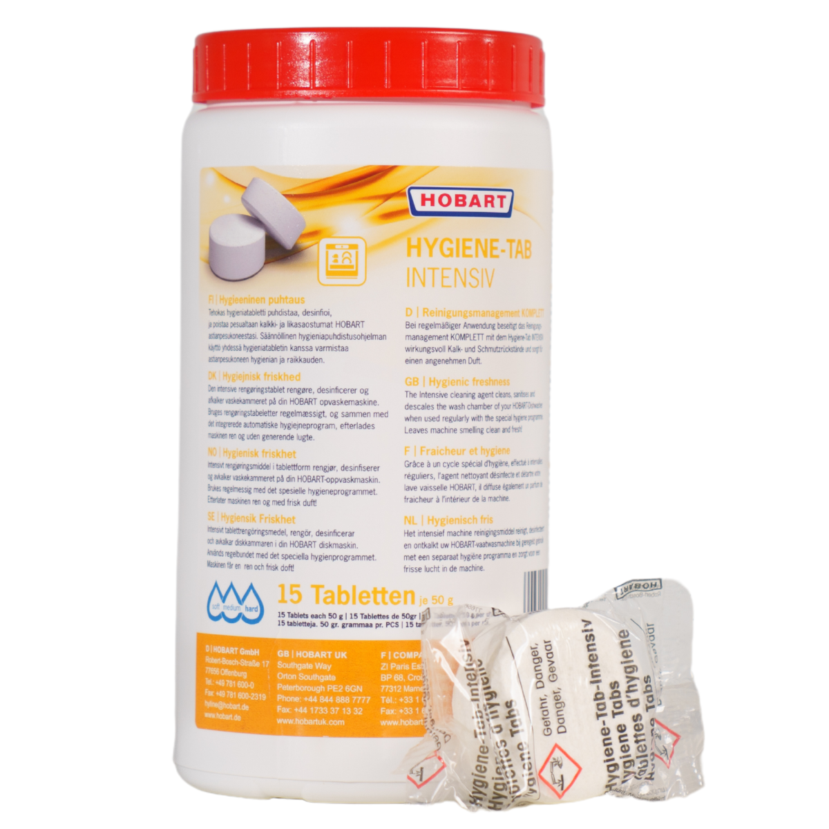 The Hobart HYLINE INTENSIV Hygiene Tablets are specially designed by Hobart for use with your Hobart warewasher. Easy to use with your machine's hygiene cycle, these tablets will help effectively remove residue and leave your machine hygienically clean.